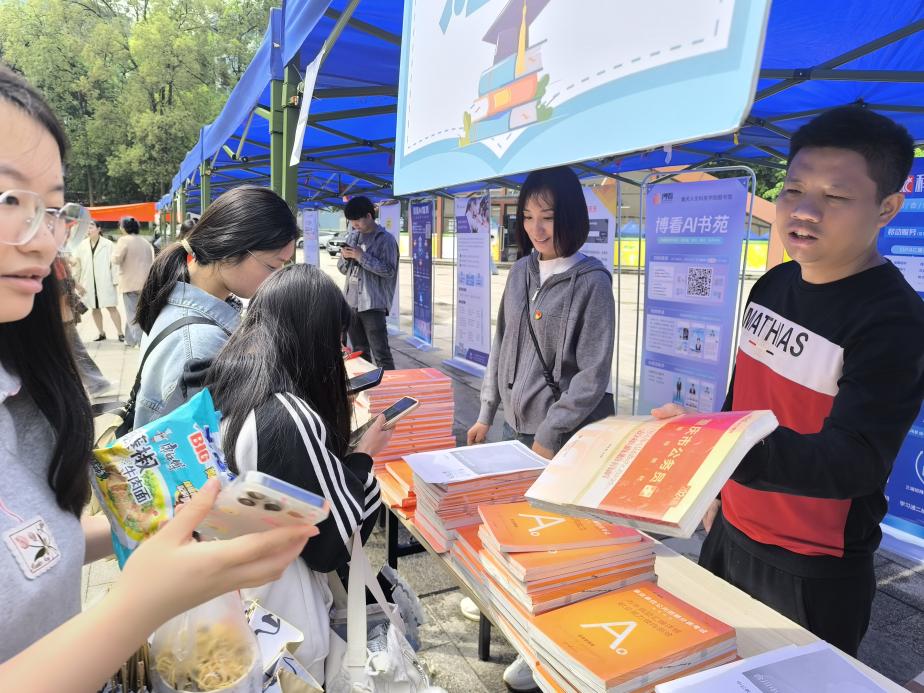 当天,支部结合2025年读书月系列活动在智园民族团结广场举办“行知文化长廊”资源展览,以“纸电文献资源展阅+AI馆员互动+借阅盲盒”寓教于学的形式,向读者全面展示了图书馆在纸质文献、数字资源、智慧化建设方面的成果。同时,积极为师生办理图书借阅,发放数字资源宣传手册、检索指南等资料,并耐心讲解数据库的不同特点和操作技巧,推动知识服务“零距离”。