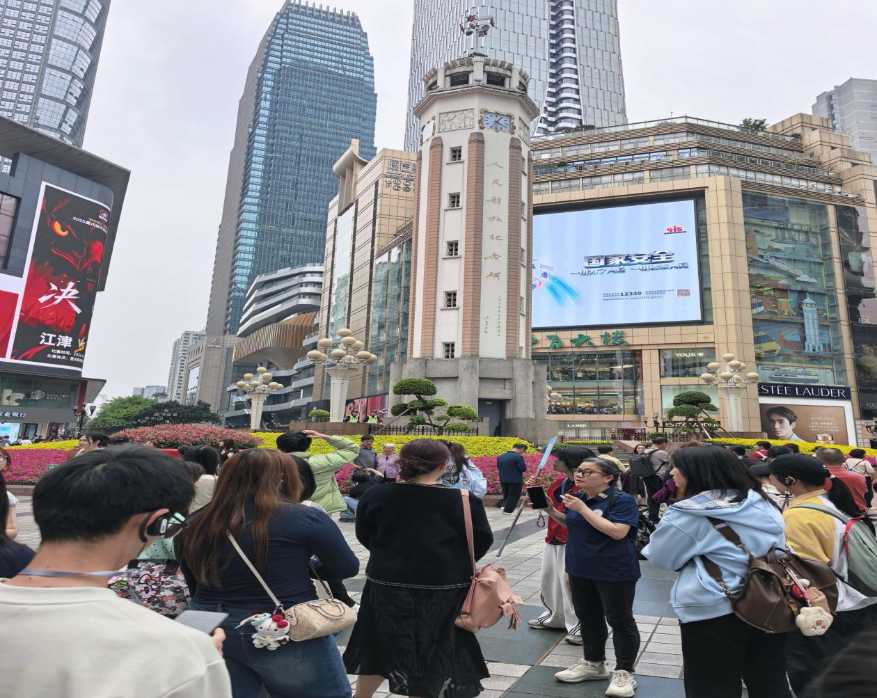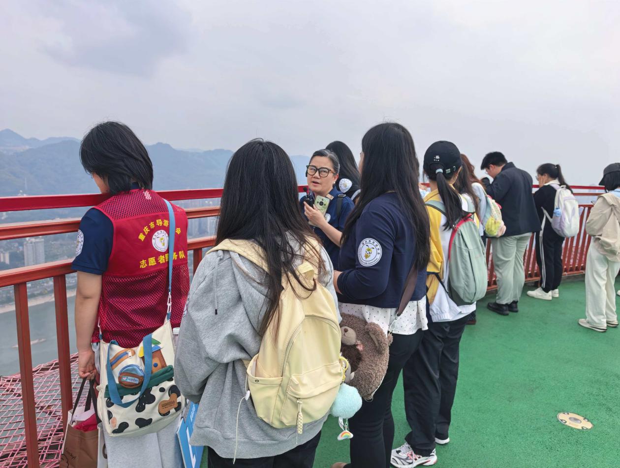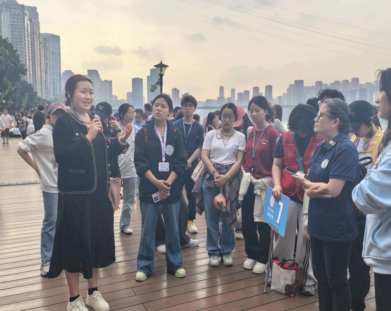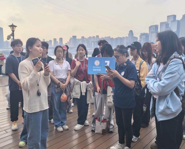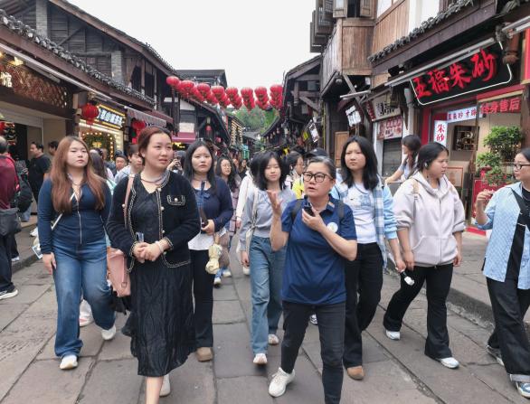 陆敏老师带领同学们踩线磁器口、李子坝轻轨站、三峡博物馆、云端之眼、解放碑、洪崖洞等景点,现场讲解重庆概况、立体交通、巴渝文化、红色文化、网红景点等核心讲解要点,传授实训技巧、地接带团基本流程等实操技能。实训路线设置紧密结合重庆“网红”效应出现后新生游客需求,帮助同学们在职业起点掌握了必备的基本技能,为后续研学团带队、文旅行业实习就业筑牢了基础。同学们纷纷感慨通过老师指导和实地训练,他们加深了对旅游服务行业的认知,增强了职业认同感与责任感,并在真实环境中感受到了导游工作的挑战和乐趣,表示将认真理解消化老师教授的知识,灵活运用于实践。